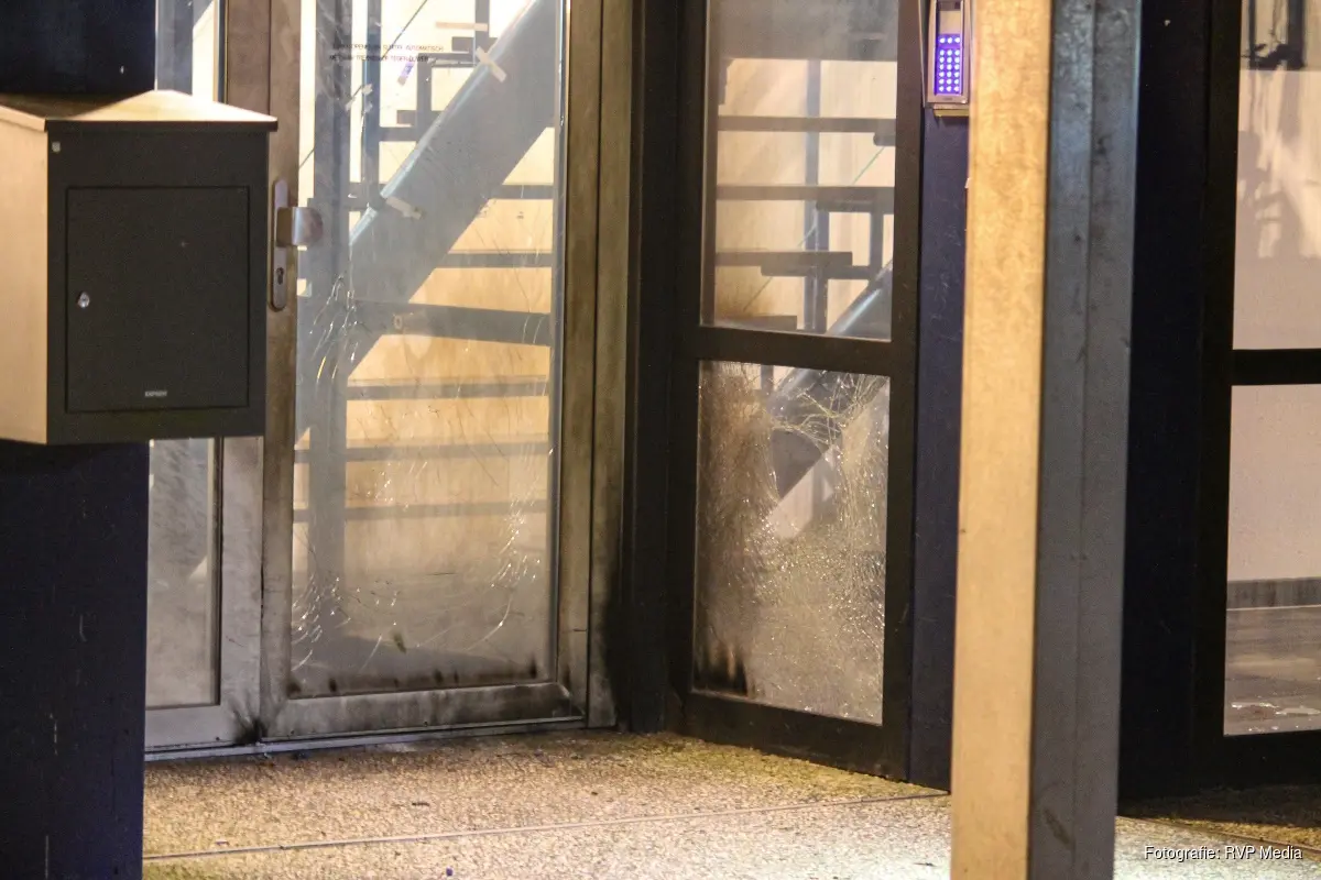 Door de explosie is er flinke schade onstaan aan de ingang van het pand.